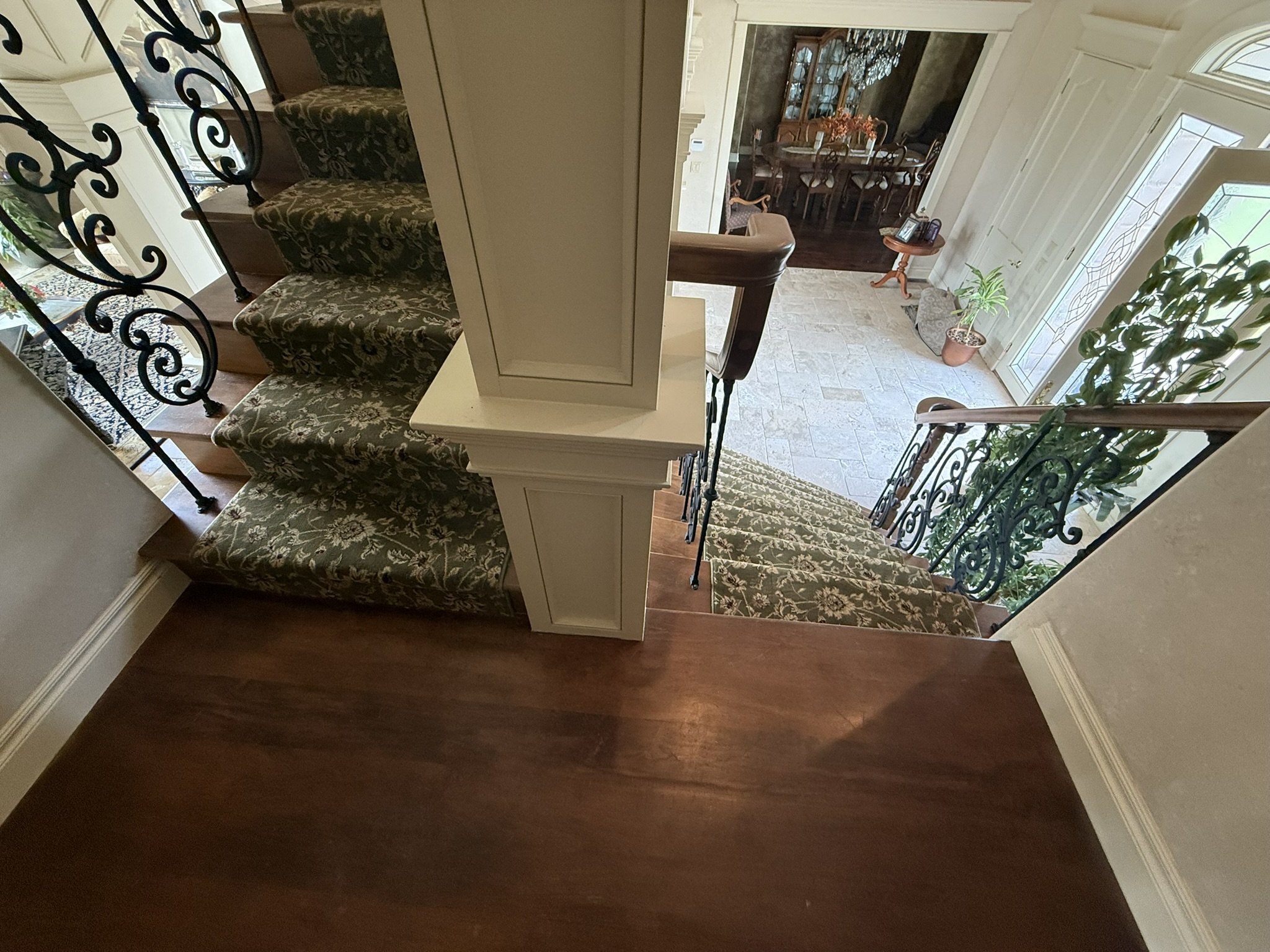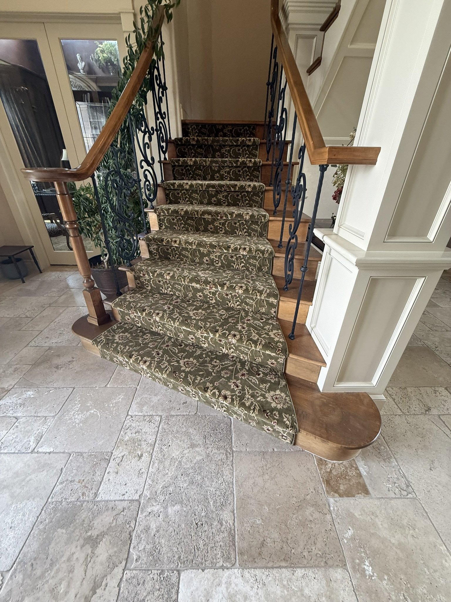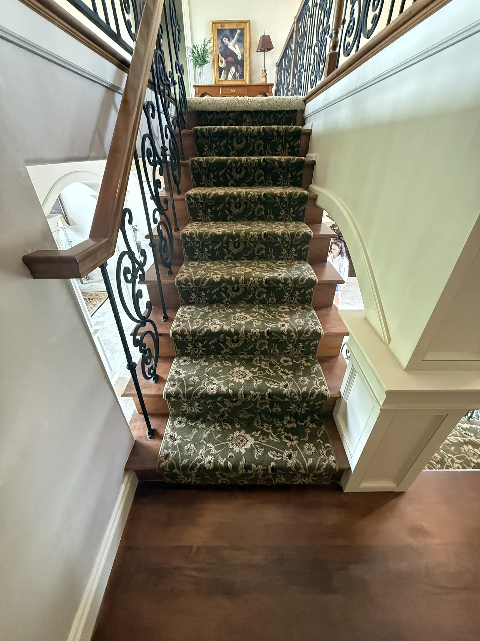 Broadloom carpet product, constructed in our workshop finished with matching serging yarn. Brought to life on this beautiful staircase June, 2025.
