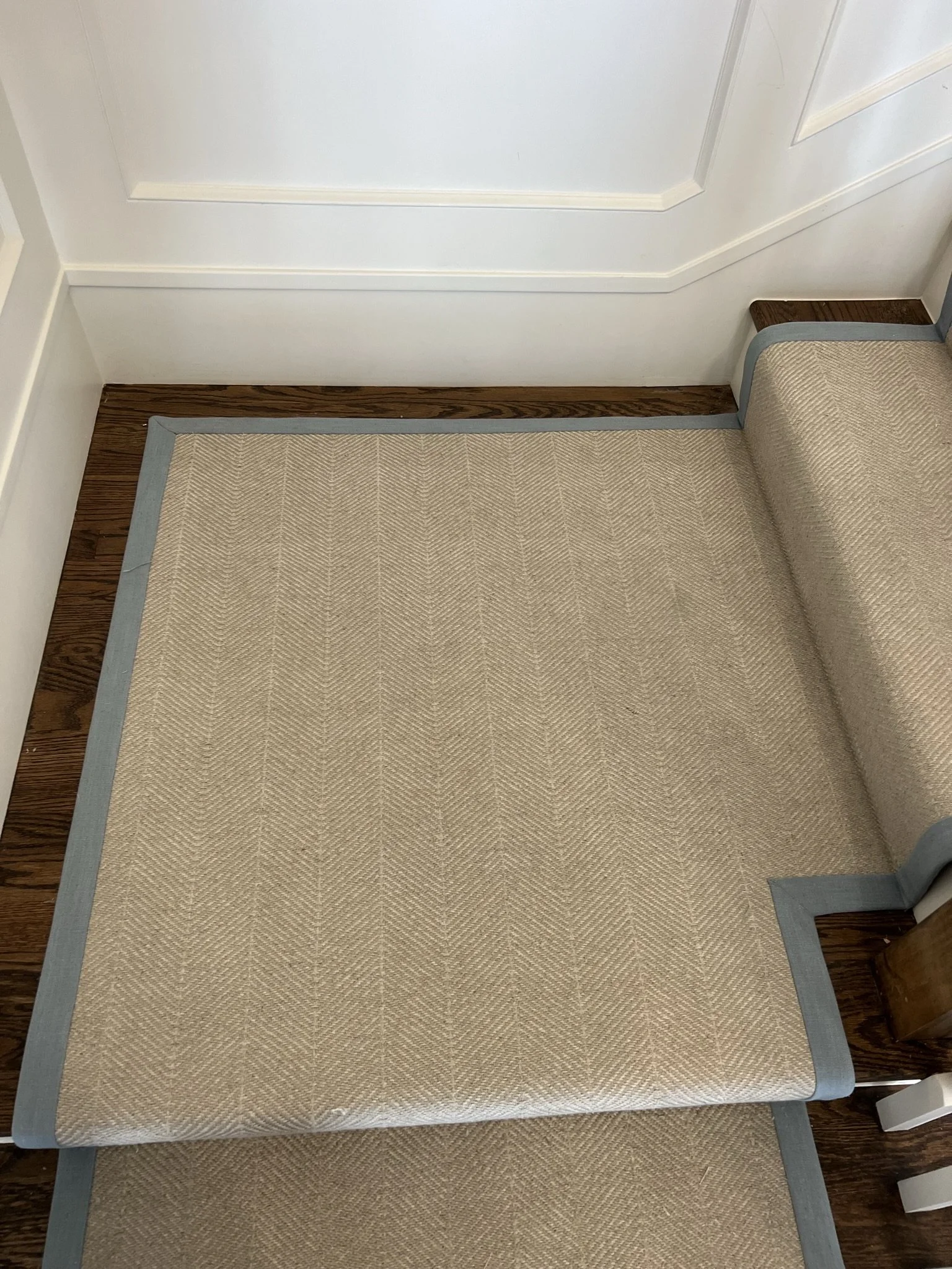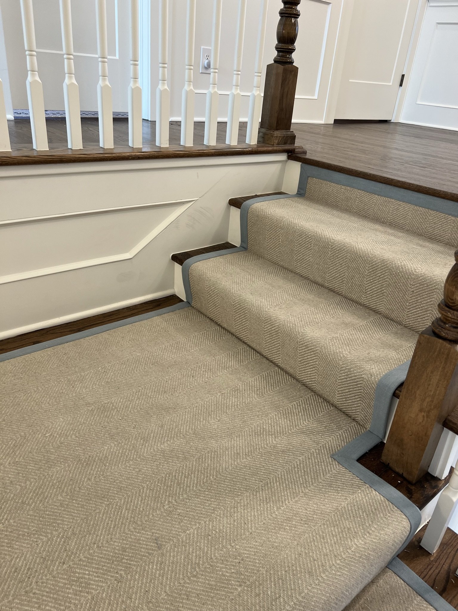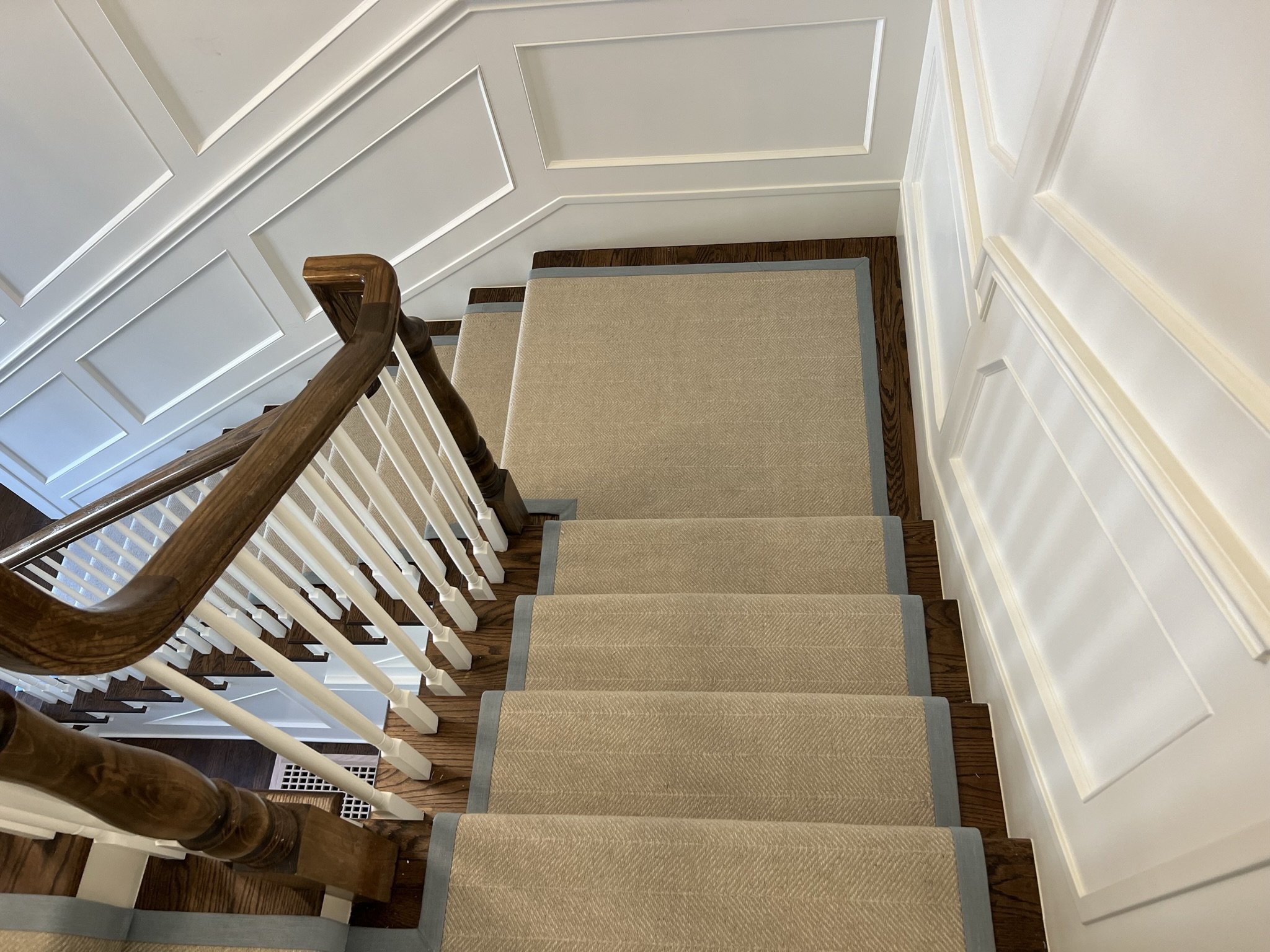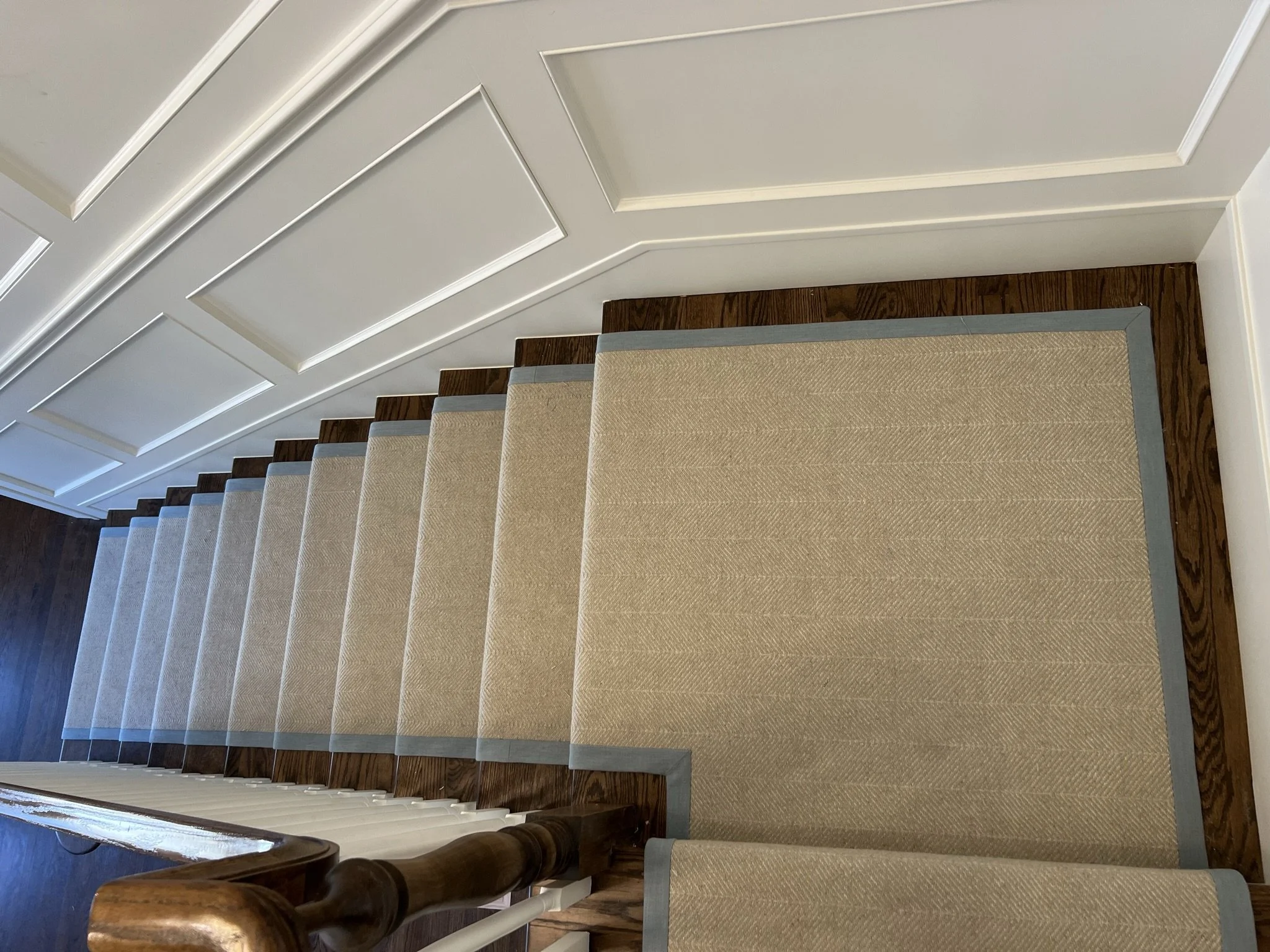 Broadloom Staircase Runner with Upholstered Stair Edges and Mitered Landing