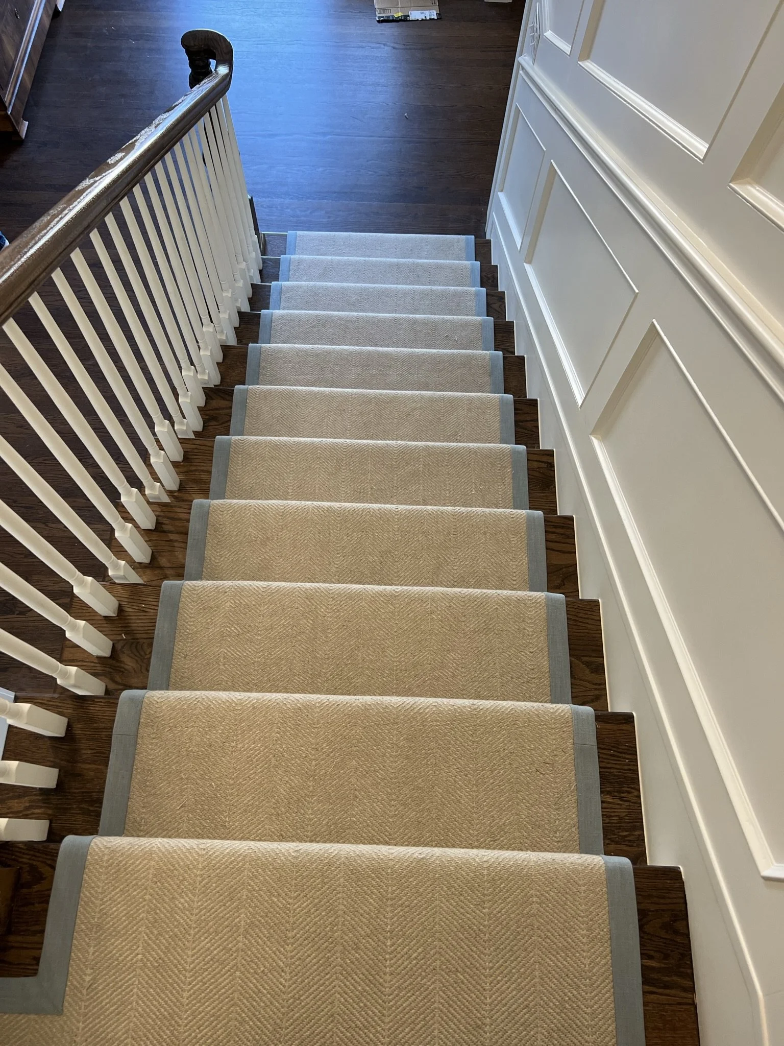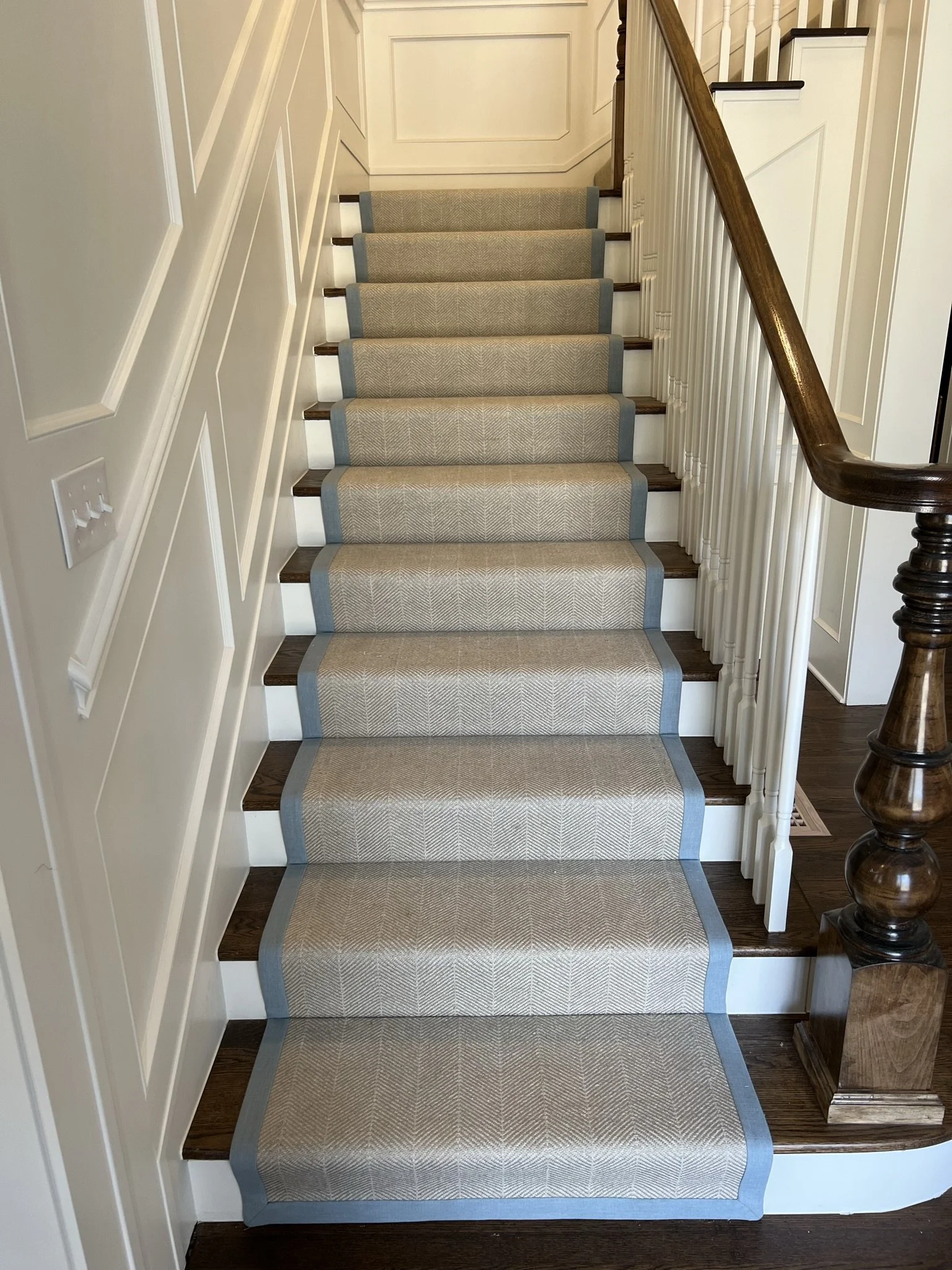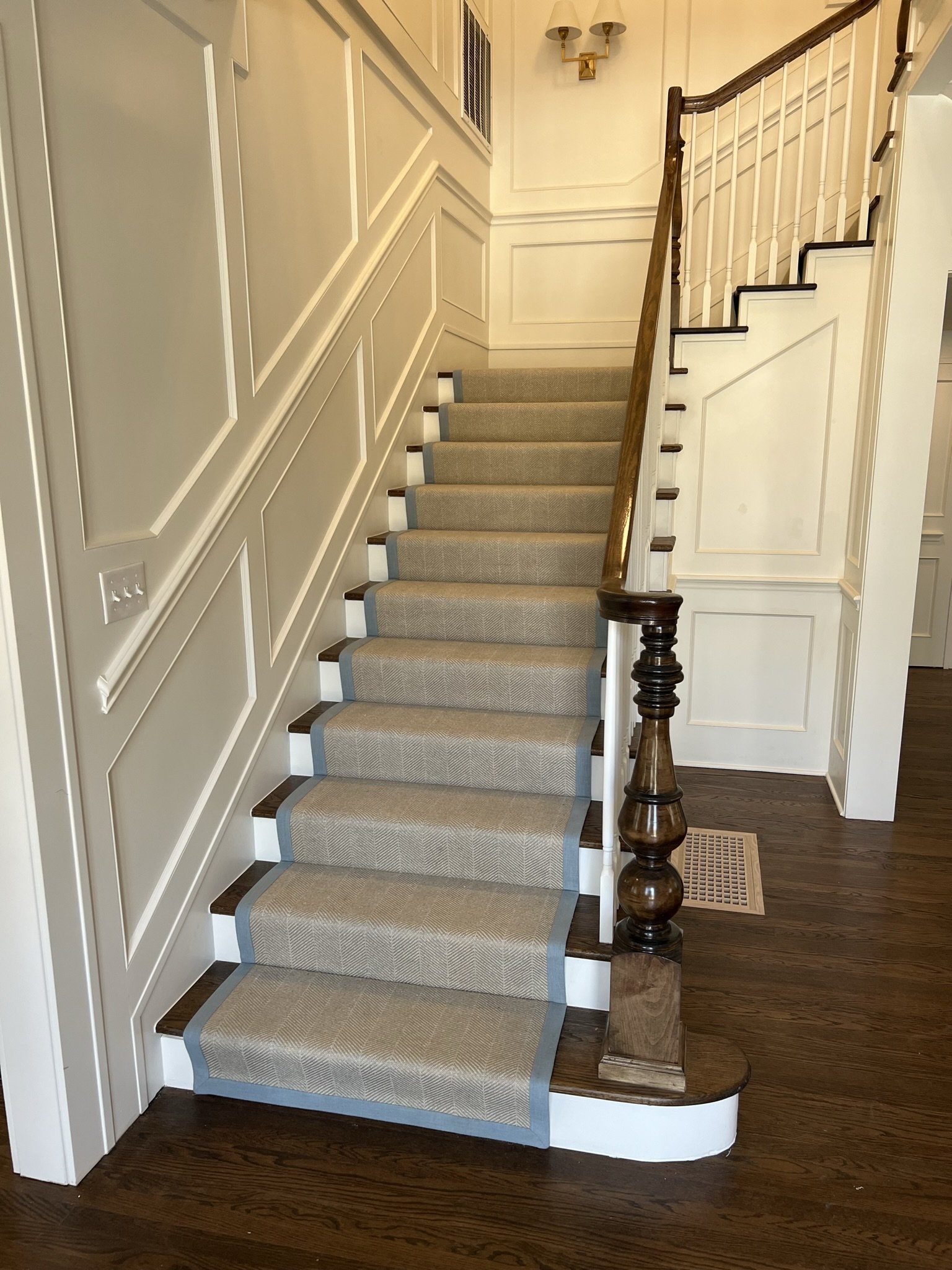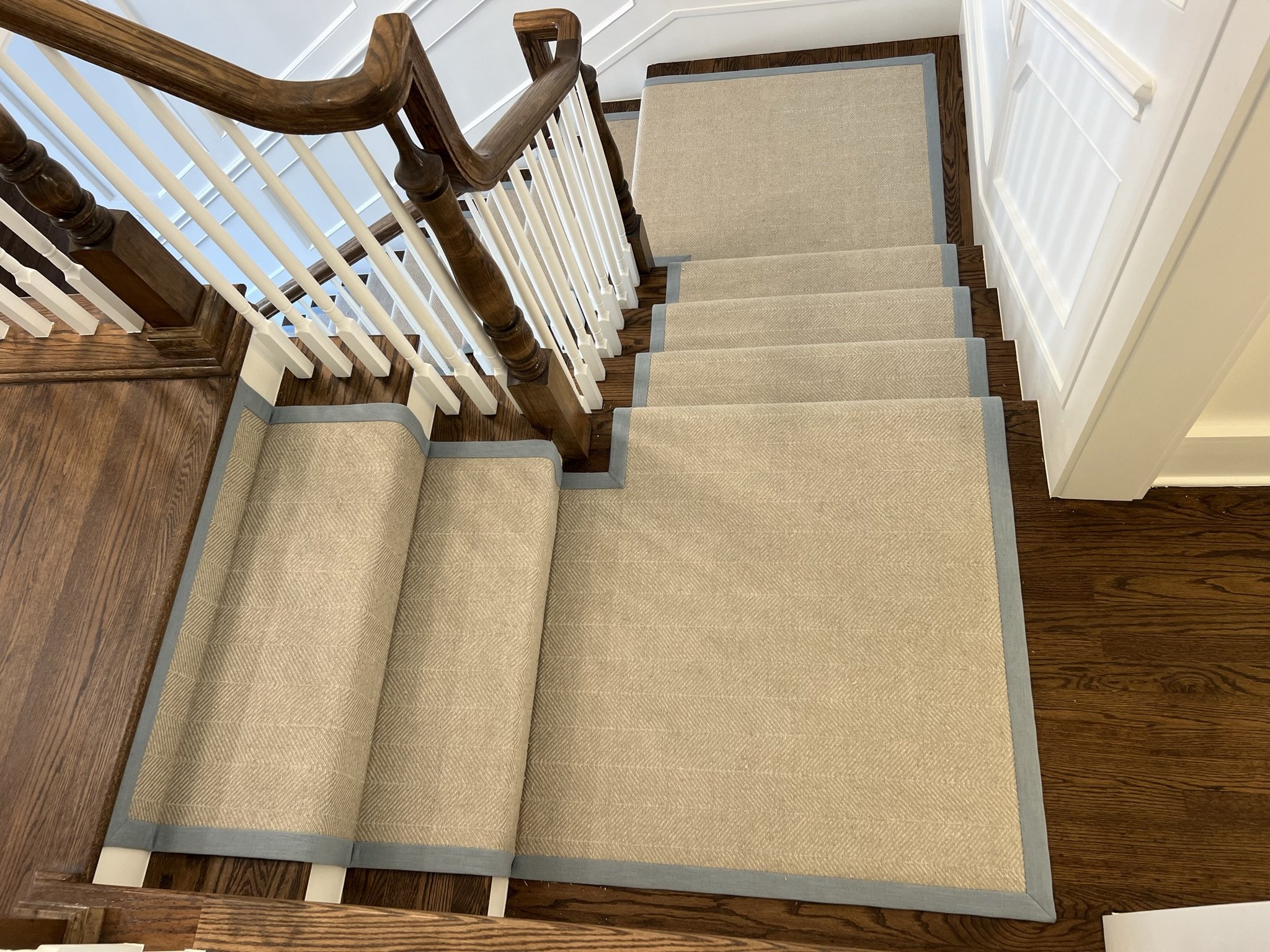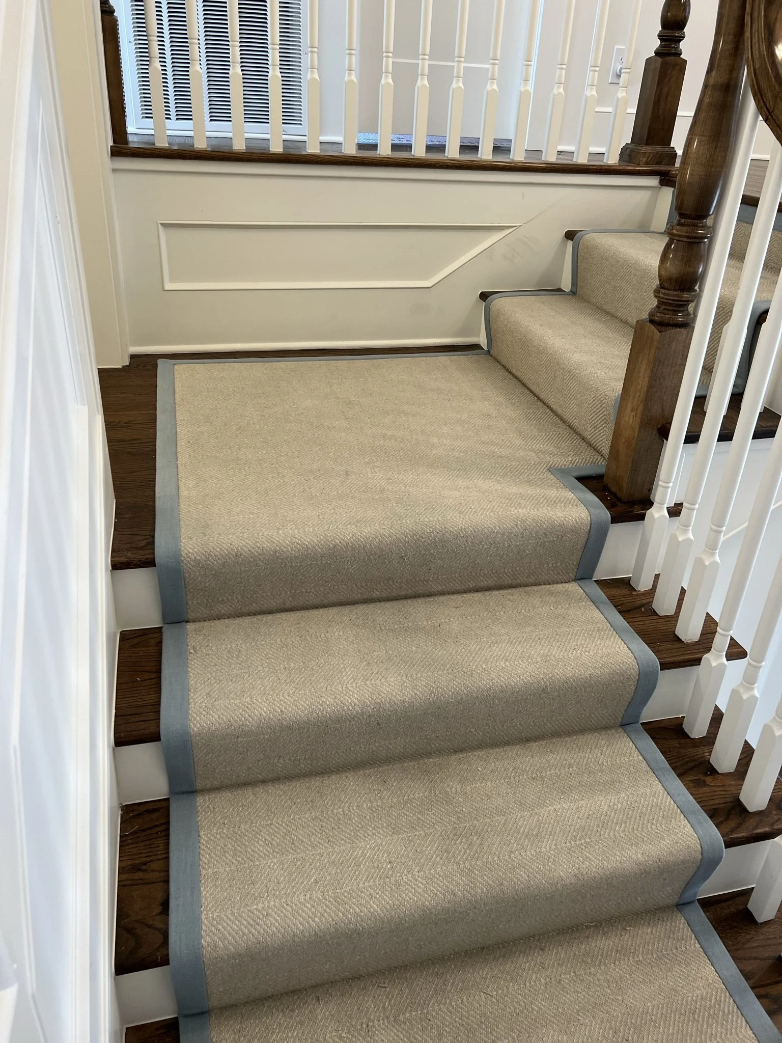 Broadloom Staircase Runner with Upholstered Stair Edges and Mitered Landing