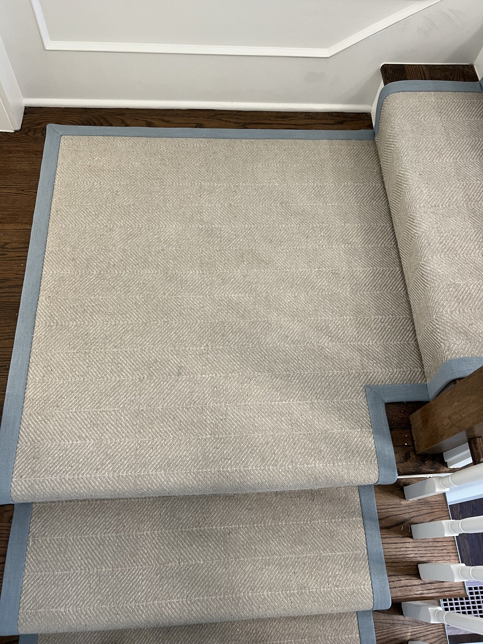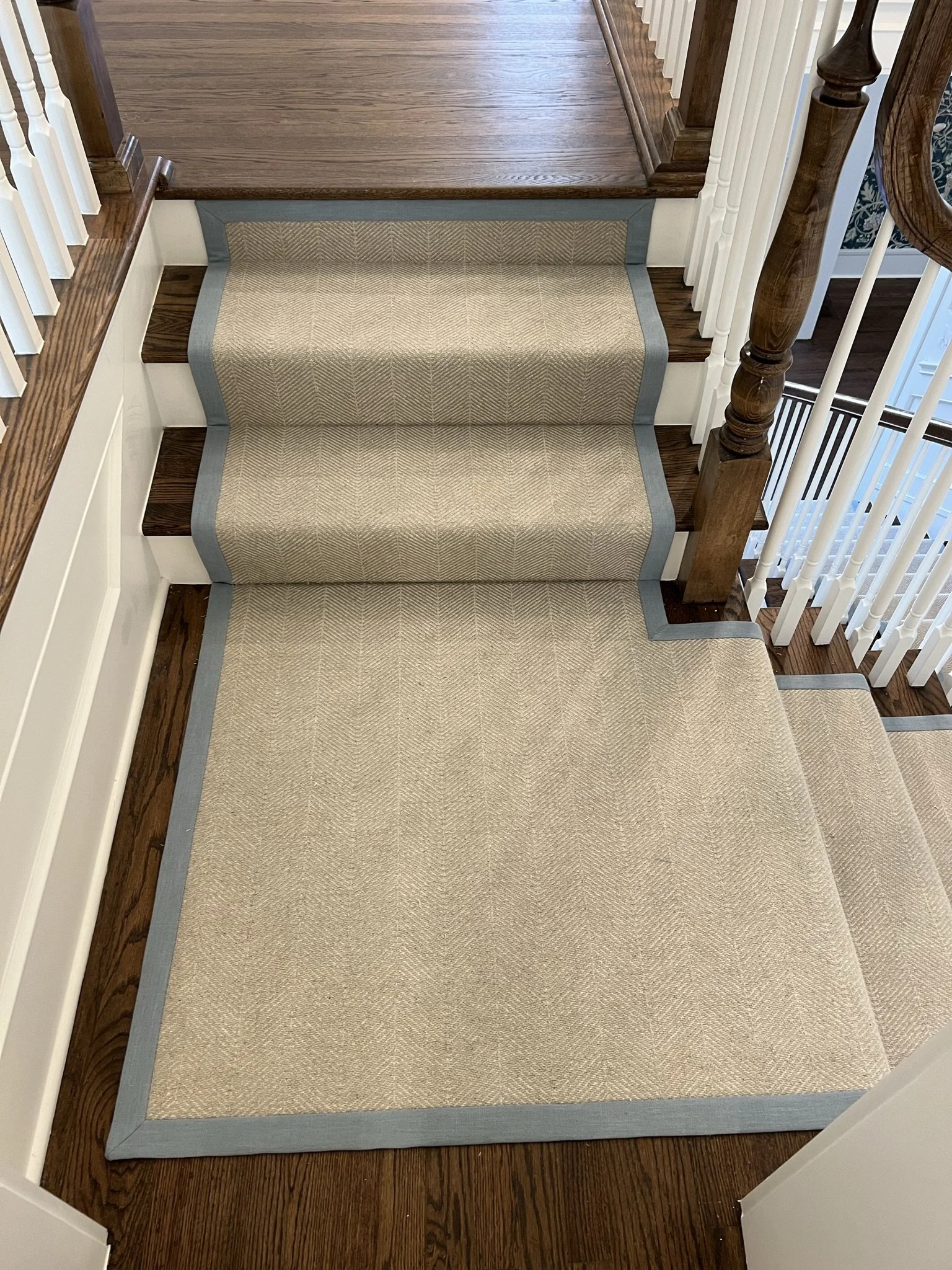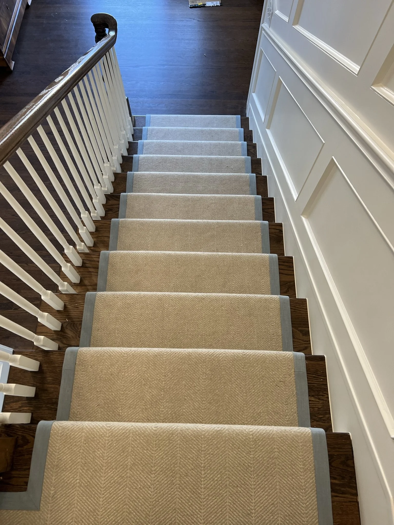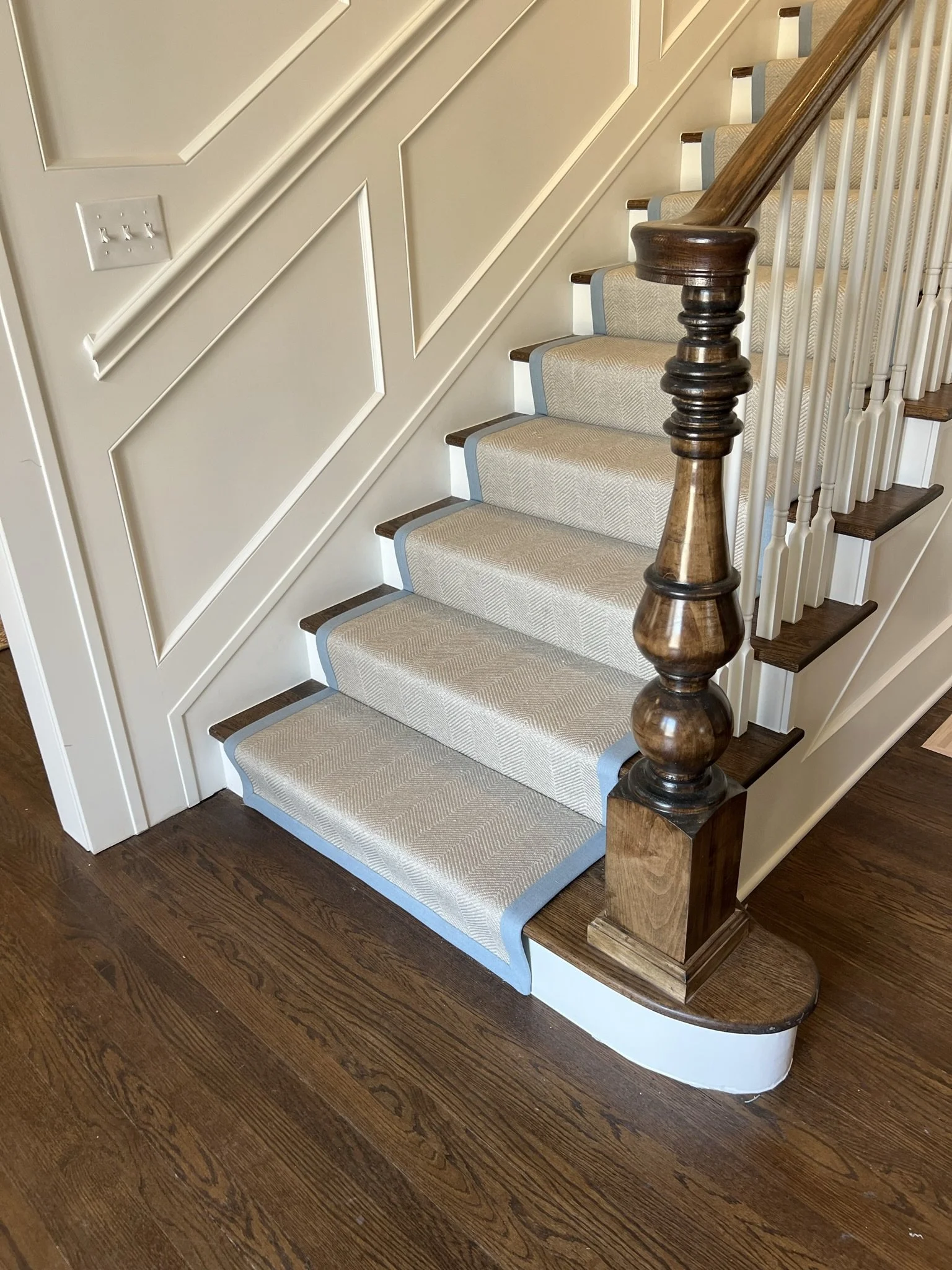 Broadloom Staircase Runner with Upholstered Stair Edges and Mitered Landing