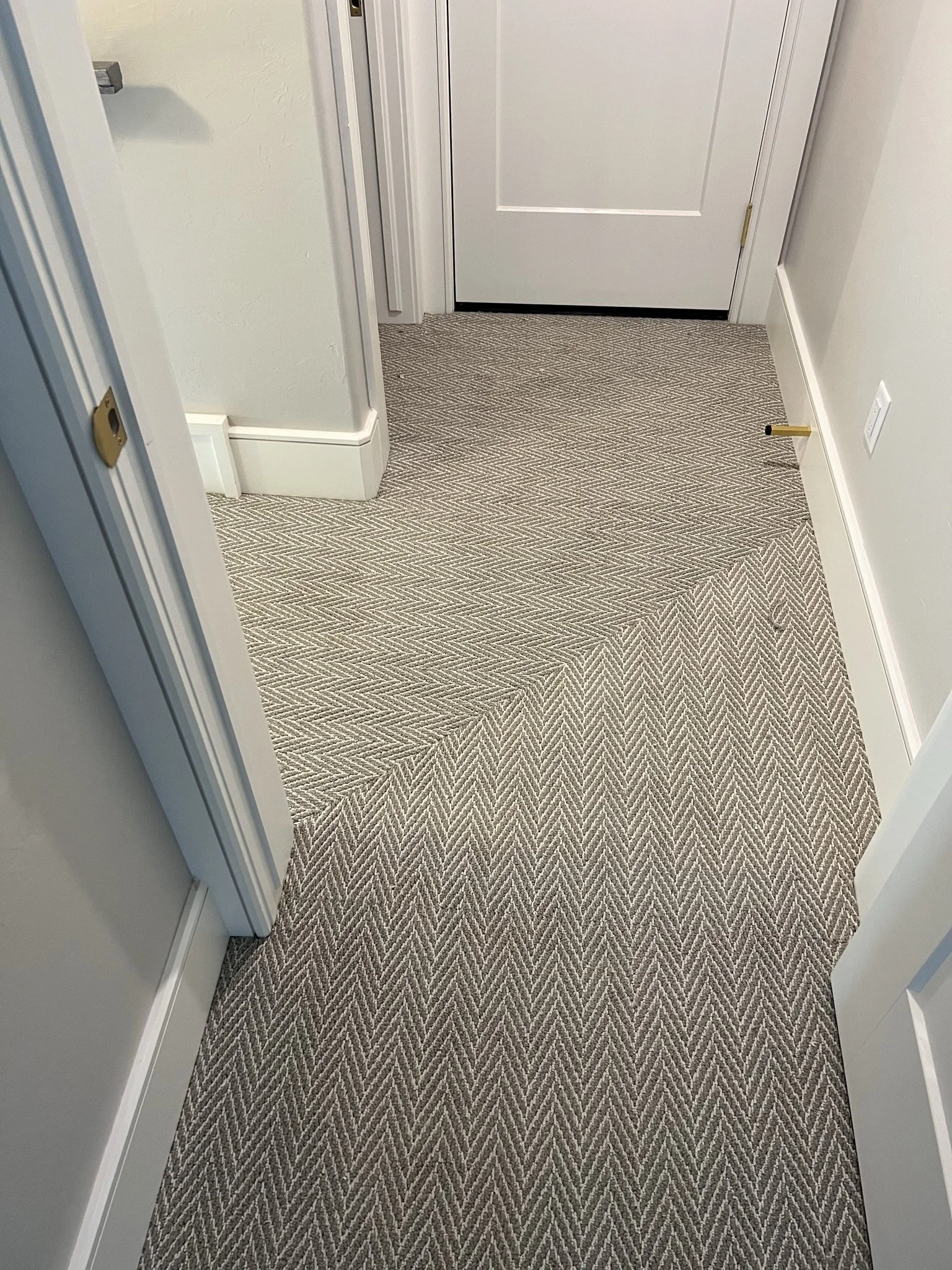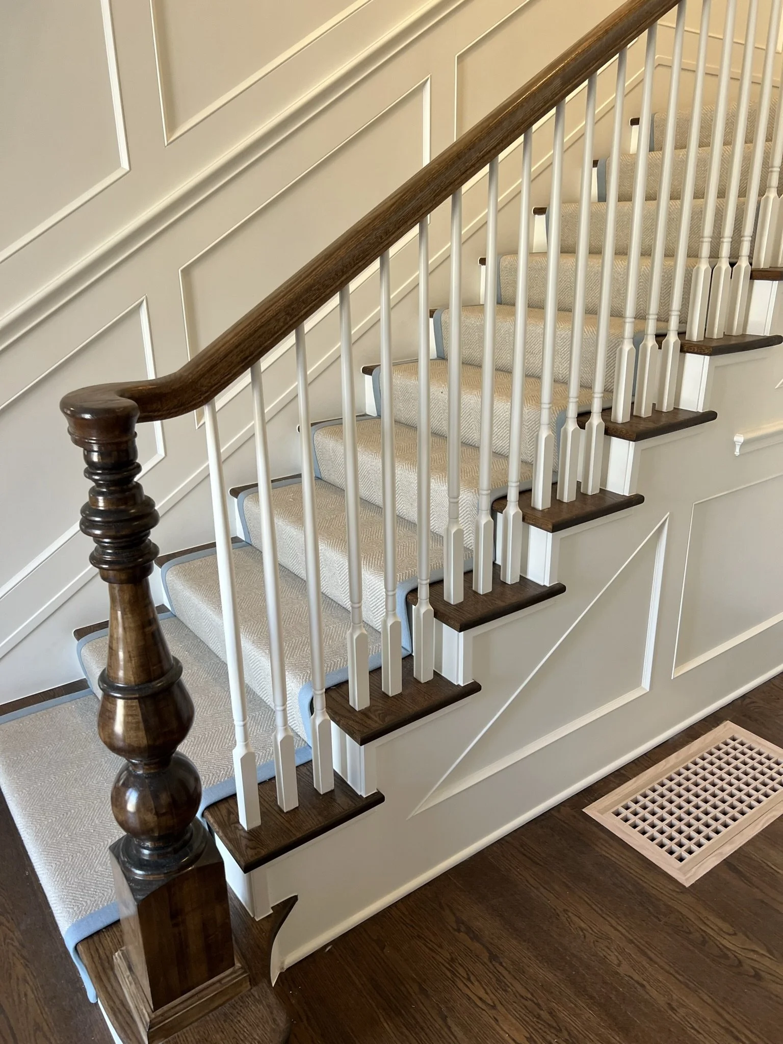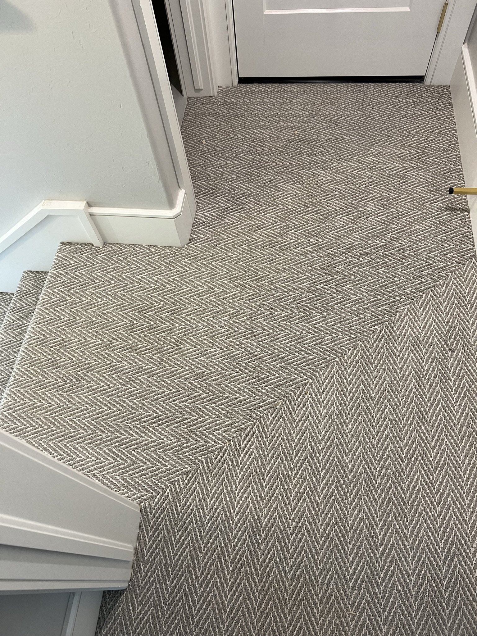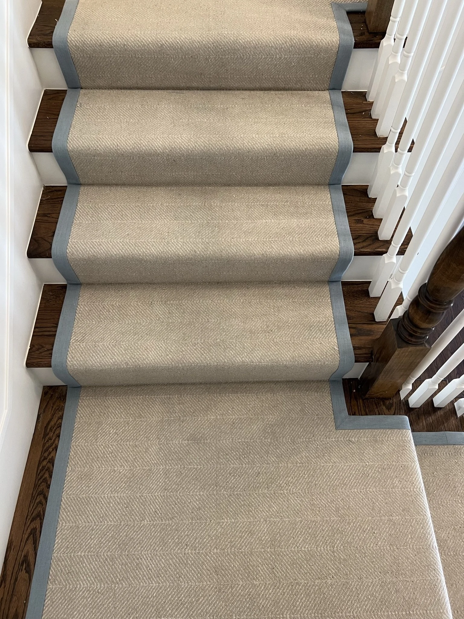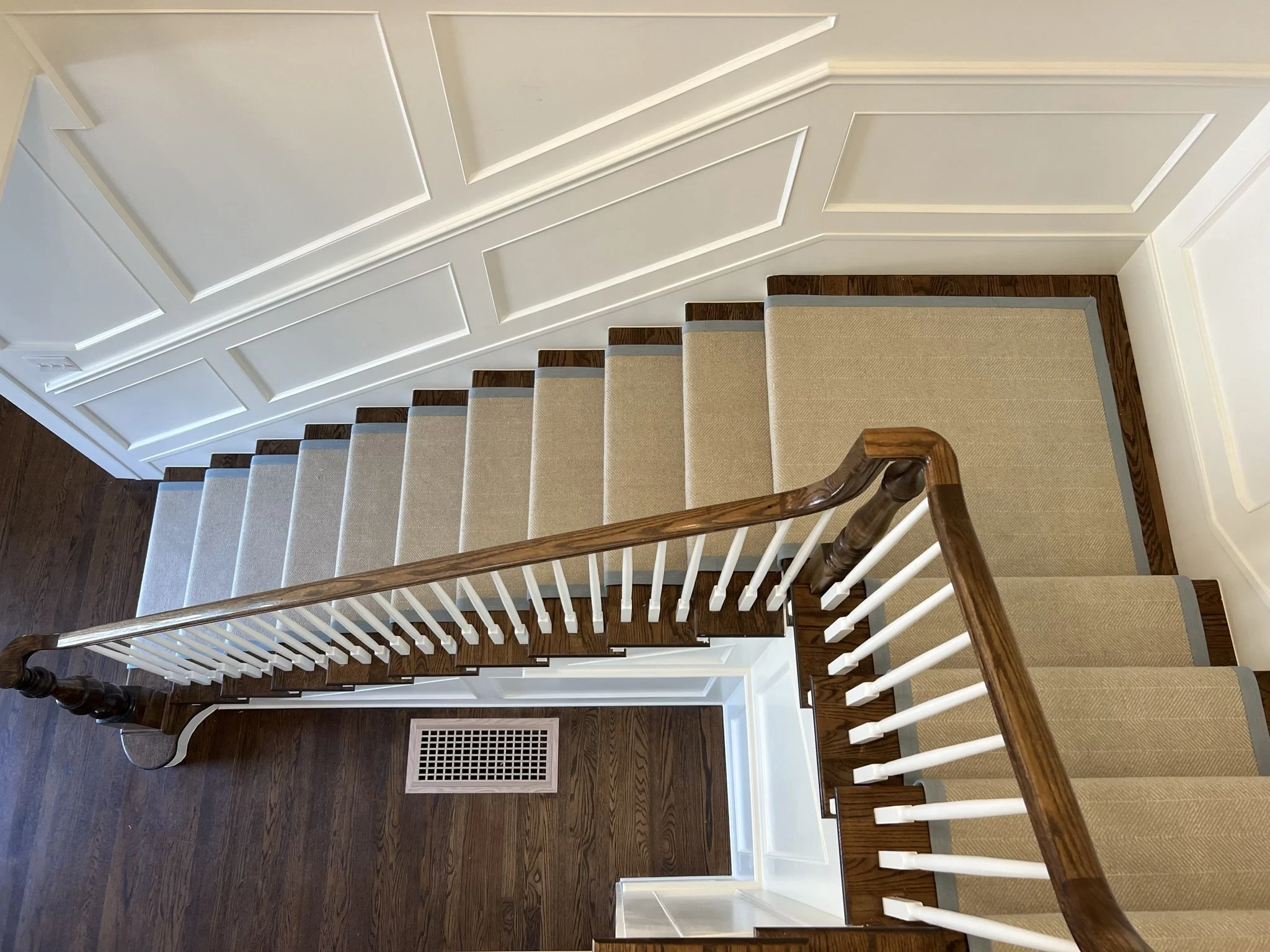 Broadloom Staircase Runner with Upholstered Stair Edges and Mitered Landing